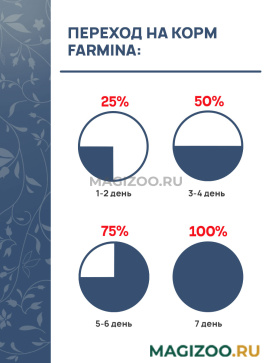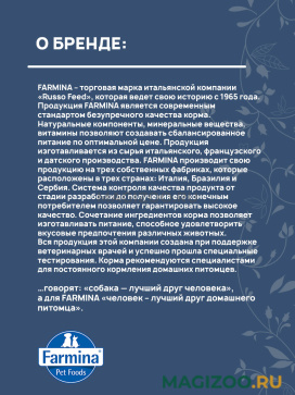 Информация о составе и ингредиентах, цветовом решении, технических и иных характеристиках, стране-изготовителе, внешнем виде и комплекте поставки товара носит справочный характер и основана на последних доступных к моменту публикации сведениях. Доставка данного товара осуществляется во все регионы РФ.Продукция FARMINA является современным стандартом безупречного качества корма. Натуральные компоненты, минеральные вещества, витамины позволяют создавать сбалансированное питание по оптимальной цене. Продукция изготавливается из сырья итальянского, французского и датского производства. FARMINA производит свою продукцию на трех собственных фабриках, которые расположены в трех странах: Италия, Бразилия и Сербия.
