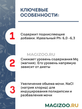 - Белки животного происхождения и кукурузная клейковина для поддержки кислой Ph-мочи.