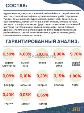 Куриное филе, гидролизованный рыбный белок, сырой яичный желток, сладкий картофель, куриная печень, рыба (сардина и тунец), семена киноа, куриный жир, рыбий жир, семена льна, свиная печень, печень ягненка, калий хлорид, хлорид натрия, дигидрат сульфата кальция, фруктоолигосахариды, дрожжевой экстракт (источник манноолиго-сахаридов), сухие пивные дрожжи.