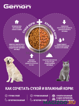 GEMON – это линейка кормов, содержащая все необходимое для отличного самочувствия ваших питомцев, их правильного роста и развития на протяжении всей жизни. Все корма приготовлены из высококачественных продуктов, богатых белками, витаминами и минералами и подходят для ежедневного кормления Ваших четвероногих друзей. Ассортимент GEMON предусматривает рецептуры, необходимые для питания животных различного возраста, образа жизни, размеров и веса.