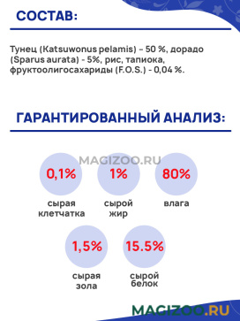 Тунец (Katsuwonus pelamis) – 50 %, дорадо (Sparus aurata) - 5%, рис, тапиока, фруктоолигосахариды (F.O.S.) - 0,04 %.