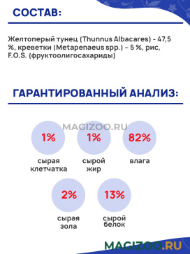 Состав: желтоперый тунец (Thunnus Albacares) - 47,5 %, креветки (Metapenaeus spp.) – 5 %, рис, F.O.S. (фруктоолигосахариды).