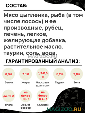 Состав: мясо цыпленка, рыба (в том числе лосось) и ее производные, рубец, печень, легкое, желирующая добавка, растительное масло, таурин, соль, вода.