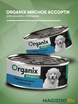 ORGANIX мясное ассорти с кроликом – вкусный консервированный корм для щенков, изготовленный из 100% свежего мяса.