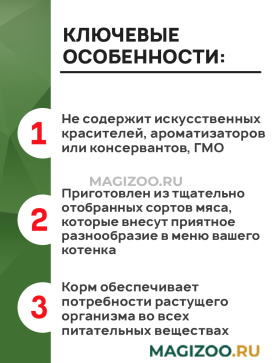 Приготовлен из тщательно отобранных сортов мяса, которые внесут приятное разнообразие в меню вашего котенка. Корм обеспечивает потребности растущего организма во всех питательных веществах.