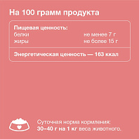 Рекомендации по кормлению: Суточная норма 25 гр на 1 кг веса животного. Использовать при комнатной температуре.