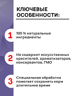 Корм изготовлен из тщательно отобранных натуральных ингредиентов высокого качества и НЕ содержит никаких искусственных добавок, консервантов, ГМО, а так же пшеницу и сою.
