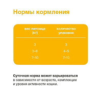 Рекомендации по кормлению: Переход с предыдущего рациона осуществлять постепенно, небольшими порциями в течение 5-7 дней. При кормлении необходимо учитывать активность и аппетит животного. Корм должен быть комнатной температуры. Содержимое открытой упаковки хранить при температуре +5°С и использовать в течение 2 дней. У кошки всегда должен быть доступ к свежей питьевой воде.
