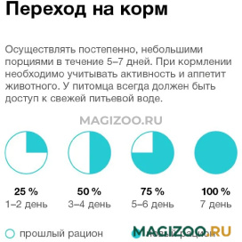 Рекомендации по кормлению: суточная норма: 40-60 г на 1 кг веса животного. Разбейте суточную норму на 2-3 приёма и доведите корм до комнатной температуры перед употреблением.