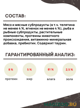 - Сочетание телятины и ягненка подобрано для кошек, которые плохо едят «простенькие» корма и хотят блюдо посложнее.