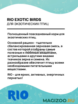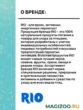 RIO – приносит радость в дом веселого пернатого питомца и его владельца. В состав продуктов RIO входят самые лучшие зерна, семена, фрукты, орехи, овощи, редкие плоды и многое другое. Важнейшими составляющими здоровья пернатого питомца являются хорошее настроение и внимание со стороны владельца. Вот почему в широкий ассортимент бренда RIO входят не только разнообразные корма и специализированные рационы, но и оригинальные лакомства, витамины и добавки.