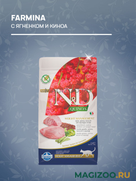 FARMINA CAT N&D GRAIN FREE QUINOA WEIGHT MANAGEMENT LAMB – уникальная формула для поддержания идеального веса кошек. Также помогает животным со склонностью к избыточному весу поддерживать идеальный вес, не отказываясь от вкусной еды.