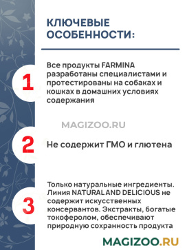 - Все продукты FARMINA разработаны специалистами и протестированы на собаках и кошках в домашних условиях содержания