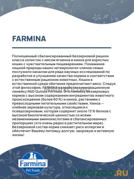 Понимание хищной природы наших четвероногих членов семьи послужило началом для ряда научных исследований по разработке и улучшению качества кормов в соответствии с естественным рационом животных. Кошки в естественной среде обитания предпочитают мясо. Следуя этой философии, FARMINA разработала инновационную линейку N&D Quinoa Formula. Это линейка беззерновых кормов с высоким содержанием ингредиентов животного происхождения (более 60 %) и киноа, растением с превосходными питательными свойствами. Киноа — хлебная зерновая культура, относящаяся к псевдозерновым, которая содержит около 13 % белков с высокой биологической ценностью со всеми незаменимыми аминокислотами в сбалансированных пропорциях (что очень редко в растительном мире).