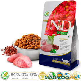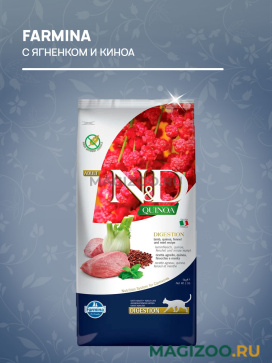 FARMINA CAT N&D GRAIN FREE QUINOA DIGESTION LAMB - уникальная формула для здоровья кишечника Вашего питомца. В состав корма входит: Фенхель: способствует поглощению питательных веществ и уменьшает ферментацию. Является источником флавоноидов, которые обеспечивают антиоксидантное действие. Мята: стимулирует желудочную активность, которая способствует пищеварению. Также обладает спазмолитическим и усиливающим эффектом.
