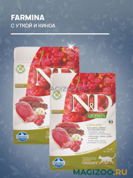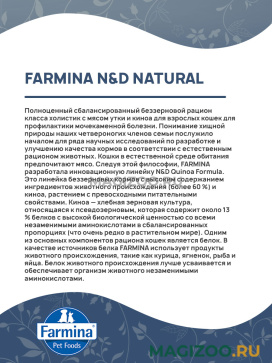 FARMINA CAT N&D GRAIN FREE QUINOA URINARY DUCK - уникальная формула для восстановления мочевых путей и предотвращения мочекаменной болезни. В состав корма входит: Клюква: богата витаминами А и С. Способствует здоровью желудочно-кишечного тракта. Помогает регулировать уровень глюкозы в крови. Ромашка: обладает противовоспалительным и успокаивающим воздействием на организм. Содержание флавоноидов делает ромашку очень полезной в пищеварении. Ромашка незаменима для профилактики болезней сердечно-сосудистой системы.