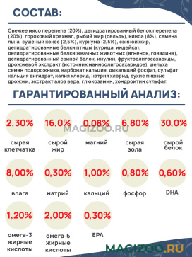 Свежее мясо перепела (20%), дегидратированный белок перепела (20%), гороховый крахмал, рыбий жир (сельдь), киноа (8%), семена льна, сушеный кокос (2,5%), куркума (2,5%), свиной жир, дегидратированные белки птицы (курица, индейка), дегидратированные белки жвачных животных (ягненок, говядина), дегидратированный свиной белок, инулин, фруктоолигосахариды, дрожжевой экстракт (источник манноолигосахаридов), шелуха семян подорожника, карбонат кальция, дикальций фосфат, сульфат кальция дигидрат, калия хлорид, натрия хлорид, сухие пивные дрожжи, экстракт алоэ вера, глюкозамин, хондроитин сульфат.
