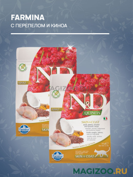 FARMINA CAT N&D GRAIN FREE QUINOA SKIN & COAT QUAIL - уникальная формула для чувствительного пищеварения, полезная для восстановления и поддержания здоровья кожи и шерсти. В состав корма входит: Кокос: богат цинком, содержит необходимые элементы для защиты кожи: медь, железо, калий, магний, фосфор и натрий. Высокое содержание витаминов B и C способствует стрессоустойчивости, а также снижению влияния усталости на организм. Куркума: оказывает важное влияние на восстановление кожи и богата природными антиоксидантами.
