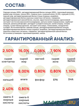 Свежая сельдь (20%), дегидратированный белок сельди (20%), гороховый крахмал, рыбий жир (сельдь), киноа (8%), семена льна, сушеный кокос (2,5%), куркума (2,5%), свиной жир, дегидратированные белки птицы (курица, индейка), дегидратированные белки жвачных животных (ягненок, говядина), дегидратированный свиной белок, инулин, фруктоолигосахариды, дрожжевой экстракт (источник манноолигосахаридов), шелуха семян подорожника, карбонат кальция, дикальций фосфат, дигидрат сульфата кальция, калия хлорид, натрия хлорид, сухие пивные дрожжи, экстракт алоэ вера, глюкозамин, хондроитин сульфат. Источники белка: свежая сельдь, дегидратированный белок сельди, дегидратированные белки птицы (курица, индейка), дегидратированные белки жвачных животных (ягненок, говядина), дегидратированный свиной белок. Источники углеводов: гороховый крахмал, киноа.