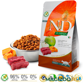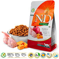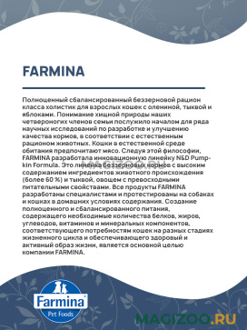 Понимание хищной природы наших четвероногих членов семьи послужило началом для ряда научных исследований по разработке и улучшению качества кормов, в соответствии с естественным рационом животных. Кошки в естественной среде обитания предпочитают мясо. Следуя этой философии, FARMINA разработала инновационную линейку N&D Pumpkin Formula. Это линейка беззерновых кормов с высоким содержанием ингредиентов животного происхождения (более 60 %) и тыквой, овощем с превосходными питательными свойствами.