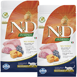 Полнорационный беззерновой корм кастрированных котов и стерилизованных кошек с ягненком, черникой и тыквой.