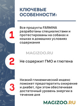 - Все продукты FARMINA разработаны специалистами и протестированы на собаках и кошках в домашних условиях содержания.