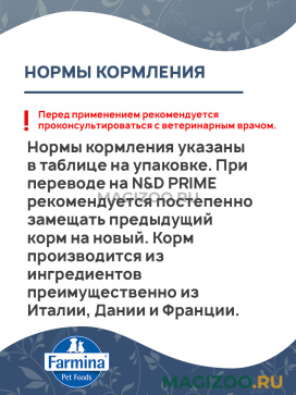 Рекомендации по кормлению: Нормы кормления указаны в таблице на упаковке. При переводе на N&D PRIME рекомендуется постепенно замещать предыдущий корм на новый. Корм производится из ингредиентов преимущественно из Италии, Дании и Франции.