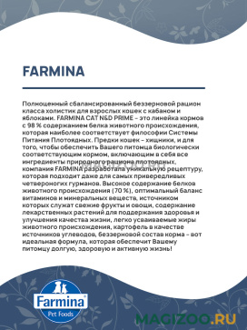 FARMINA CAT N&D PRIME – это линейка кормов с 98 % содержанием белка животного происхождения, которая наиболее соответствует философии Системы Питания Плотоядных.
