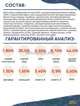 Мясо дикого кабана без костей (25%), дегидратированный белок кабана (23%), сладкий картофель, мясо курицы без костей, дегидратированные белки птицы (курица, индейка), куриный жир, дегидратированные цельные яйца, сельдь, дегидратированная сельдь, рыбий жир (сельди), свиной жир, волокна гороха, дегидратированные белки жвачных животных (ягненок, говядина), дегидратированный свиной белок, сушеная морковь, сушеная люцерна, инулин, фруктоолигосахариды, дрожжевой экстракт (источник маннoолигосахаридов), сушеные яблоки (0,5%), сушеный гранат, дегидратированный сладкий апельсин, сушеный шпинат, подорожник (0,3%), сушеная черника, хлорид натрия, сухие пивные дрожжи, куркумы (0,2%), экстракт алоэ вера.