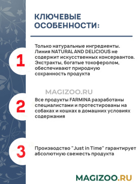 - Все продукты FARMINA разработаны специалистами и протестированы на собаках и кошках в домашних условиях содержания.