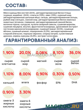 Мясо курицы без костей (24%), дегидратированные белки птицы (курица, индейка) (24%), спельта (10%), овес (10%), куриный жир, дегидратированные цельные яйца, сельдь, дегидратированная сельдь, рыбий жир (сельди), свиной жир, дегидратированные белки жвачных животных (ягненок, говядина), дегидратированный свиной белок, волокна гороха, кукуруза, пульпа сахарной свеклы, сушеная морковь, сушеная люцерна, инулин, фруктоолигосахариды, дрожжевой экстракт (источник маннoолигосахаридов), сушеный гранат (0,5%), сушеные яблоки, сушеный шпинат, подорожник (0,3%), дегидратированный сладкий апельсин, порошок черники, хлорид натрия, сухие пивные дрожжи, корень куркумы (0,2%), экстракт алоэ вера.