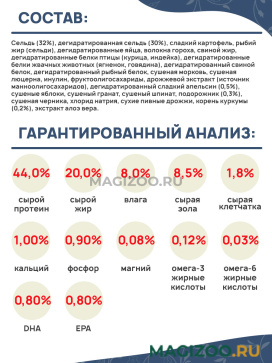 Сельдь (32%), дегидратированная сельдь (30%), сладкий картофель, рыбий жир (сельди), дегидратированные яйца, волокна гороха, свиной жир, дегидратированные белки птицы (курица, индейка), дегидратированные белки жвачных животных (ягненок, говядина), дегидратированный свиной белок, дегидратированный рыбный белок, сушеная морковь, сушеная люцерна, инулин, фруктоолигосахариды, дрожжевой экстракт (источник маннoолигосахаридов), дегидратированный сладкий апельсин (0,5%), сушеные яблоки, сушеный гранат, сушеный шпинат, подорожник (0,3%), сушеная черника, хлорид натрия, сухие пивные дрожжи, корень куркумы (0,2%), экстракт алоэ вера.