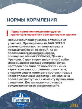 Нормы кормления указаны в таблице на упаковке. При переводе на N&D OCEAN рекомендуется постепенно замещать предыдущий корм на новый. Корм производится из ингредиентов преимущественно из Италии, Дании и Франции.