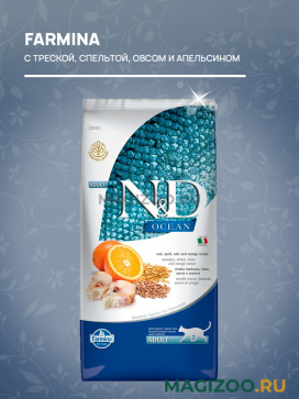 FARMINA CAT N&D OCEAN - это линия низкозерновых и беззерновых продуктов, с высоким содержанием рыбы и моллюсков.