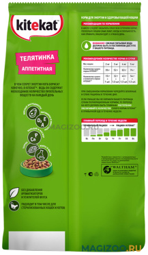 Kitekat «Телятинка аппетитная» — полноценное питание для кошек на каждый день. Состав корма разработан профессионалами: в нем содержатся белки, жиры, а также незаменимые витамины (D3, B5, B6 и др.), минералы (кальций, фосфор, магний и др.), полезные жиры, масла и таурин в правильной пропорции. Благодаря клетчатке корм хорошо усваивается, поддерживая здоровье пищеварительной системы, а за счет своей сбалансированности он подойдет и стерилизованным питомцам. Для оптимального контроля веса питомца и заботы о здоровье ротовой полости и мочевыводящей системы рекомендуется сочетать сухой корм с влажными рационами Kitekat. Качество корма Kitekat проверено временем - это источник жизненных сил и энергии для многих поколений кошек!