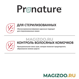 Сухие корма для питомцев PRONATURE позиционируются как соответствующие природным потребностям животных, содержащие натуральные ингредиенты и растительные экстракты. Компания-производитель называет себя одной большой семьей, а формулы кормов – «семейными рецептами».