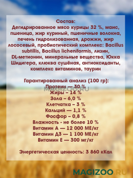 Дегидрированное мясо курицы 32 %, маис, пшеница, жир куриный, пшеничные волокна, печень гидролизованная, дрожжи, жир лососевый, пробиотический комплекс: Bacillus subtillis, Bacillus licheniformis, лизин, DL-метионин, минеральные вещества, Юкка Шидигера, клюква сушёная, антиоксиданты, комплекс витаминов, таурин.