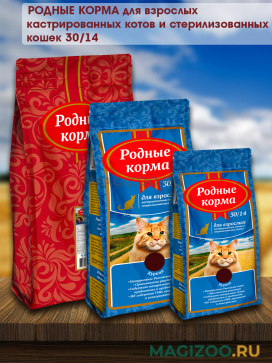 Сухой корм для кошек «Родные корма» приготовлен с учетом большинства физиологических потребностей взрослых кастрированных котов и стерилизованных кошек.