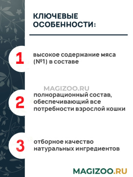 - полнорационный состав, обеспечивающий все потребности взрослой кошки;