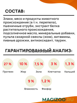 Состав этого корма удовлетворяет все потребности домашних питомцев, так как содержит натуральные ингредиенты, а так же оптимальное количество витаминов и минералов, что, в свою очередь, необходимо животному для поддержания прекрасной физической формы, формирования костной системы, шерстного покрова и иммунитета.