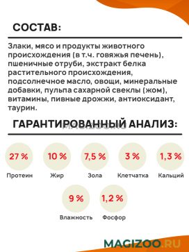 Состав этого корма удовлетворяет все потребности домашних питомцев, т.к. содержит натуральные ингредиенты, а так же оптимальное количество витаминов и минералов, что, в свою очередь, необходимо животному для поддержания прекрасной физической формы, формирования костной системы, шерстного покрова и иммунитета.