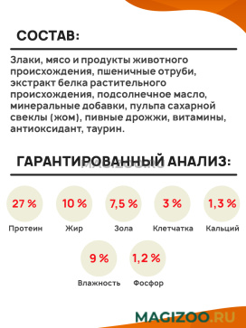 пульпа сахарной свеклы (жом), пивные дрожжи, витамины, антиоксидант, таурин.