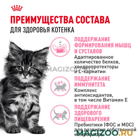 - Долгий период роста. Долгий период роста котят породы Мейн Кун обеспечивает формирование свойственного для этой породы мощного сложения. Содержит необходимое количество калорий, белков, витаминов (в том числе витамина D) и минералов (в том числе кальция и фосфора), обеспечивающих гармоничный рост и здоровое развитие костей и суставов.
