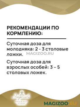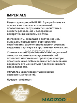 Рецептура кормов IMPERIALS разработана на основе многолетних исследований, проводимыми ведущими специалистами в области разведения и содержания декоративных животных и птиц.