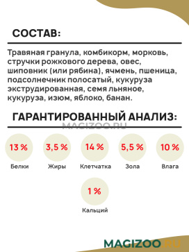 Травяная гранула, комбикорм, морковь, стручки рожкового дерева, овес, шиповник (или рябина), ячмень, пшеница, подсолнечник полосатый, кукуруза экструдированная, семя льняное, кукуруза, изюм, яблоко, банан.