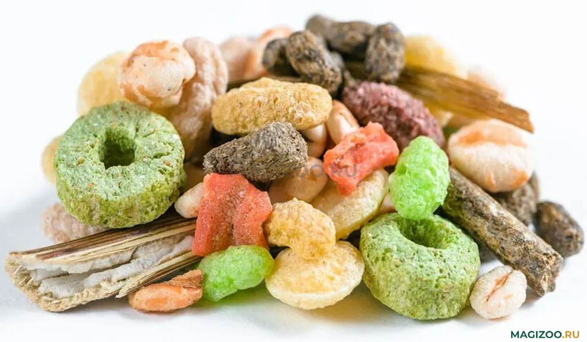 Состав: зерна пшеницы, ячменя, риса, обработанные по специальной технологии, гранулы из луговых трав, зерновые экструдированные гранулы, содержащие минеральные вещества, витамины и пивные дрожжи (самый богатый природный источник витаминов группы В); кукурузные хлопья, сушеные овощи и травы, плоды рожкового дерева.
