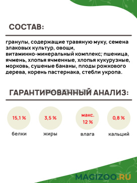 Состав: гранулы, содержащие травяную муку, семена злаковых культур, овощи, витаминно-минеральный комплекс; пшеница, ячмень, хлопья ячменные, хлопья кукурузные, морковь, сушеные бананы, плоды рожкового дерева, корень пастернака, стебли укропа.