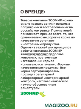 Товары компании ЗООМИР можно смело назвать одними из самых популярных и востребованных на российском рынке. Покупателей привлекает, прежде всего, то, что сравнительно не дорогие корма по качеству не уступают иностранным продуктам.