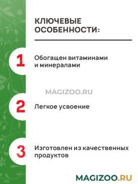 В корме Зверюшки есть все, что нужно для здоровой и активной жизни зверька: травяные гранулы, полезные и питательные семена, плющеный горох, ячменные и кукурузные хлопья, хрустящие лакомства, вкусные овощи, фрукты и зелень, минеральные вещества и витамины.