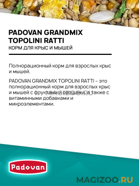 PADOVAN GRANDMIX TOPOLINI RATTI – это полнорационный корм для взрослых крыс и мышей с фруктами и овощами, а также с витаминными добавками и микроэлементами.